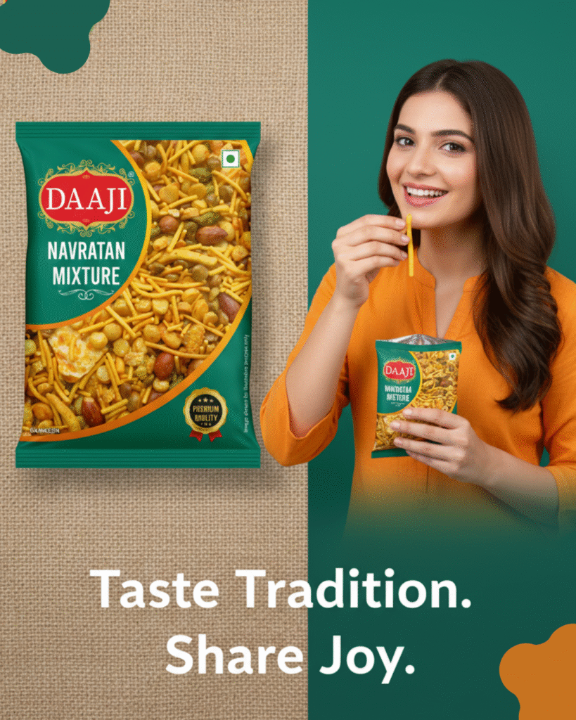 Our vision is to become a nationally loved namkeen brand known for purity, innovation, and tradition. We strive to expand our range while maintaining unmatched quality, and to be the first choice for families seeking authentic Indian snacks. Daaji Namkeen aims to build a legacy of taste that connects generations and represents the pride of Indian snacking.